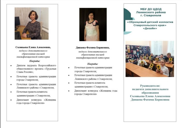 «Дизайн» - это целый мир искусства, фантазии и вдохновения, первых шагов и открытий, упорного труда и достижений. Руководителями объединения являются Соловьева Елена Алексеевна и Динаева Фатима Борисовна, педагоги высшей квалификационной категории.