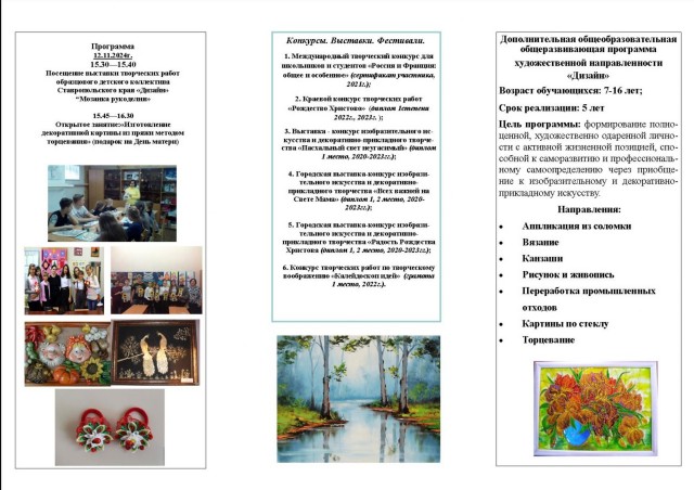 В настоящее время в объединении «Дизайн» занимается 75 обучающихся в возрасте от 6 до 18 лет. Стабильная сохранность контингента говорит о высоком мотивационном уровне реализуемой пятилетней дополнительной общеразвивающей программы, которая предполагает углубленное изучение различных разделов по декоративно – прикладному творчеству и изобразительному искусству. В программе сочетаются различные по своей технике, материалу и творческой самобытности темы, которые способствуют обогащению внутреннего мира ребенка, формируют в его сознании чувство прекрасного, развивают интерес к художественно - эстетической культуре и прививают уважение к народным традициям.